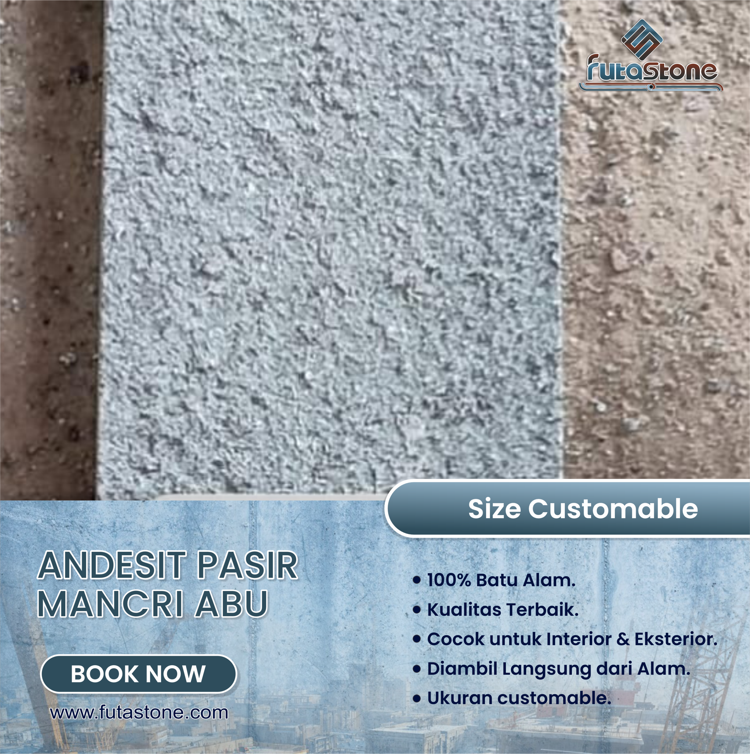 Batu Andesit Pasir Mancri Abu adalah pilihan tepat untuk menambah keindahan alami dan daya tahan pada lantai, dinding, dan area outdoor seperti teras dan taman. Dengan warna abu-abu yang halus dan tekstur pasir yang menarik, batu ini memberikan kesan elegan dan modern pada setiap proyek desain. Tahan terhadap cuaca ekstrem dan memiliki permukaan anti-slip, Batu Andesit Pasir Mancri Abu cocok untuk berbagai aplikasi eksterior dan interior.